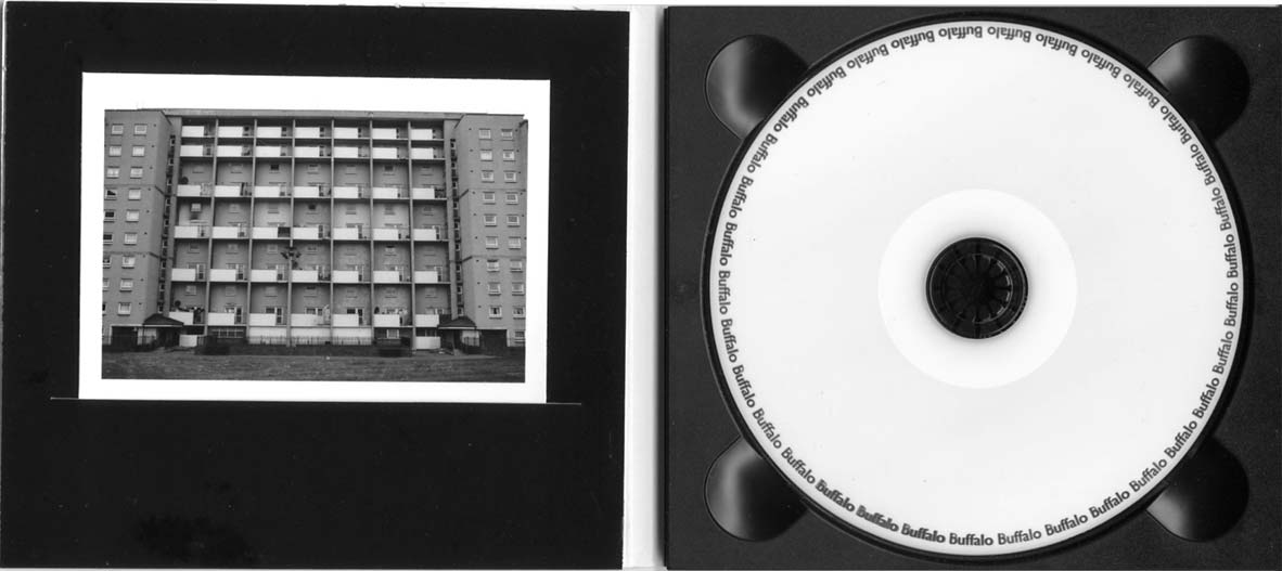 here for an image). The limited edition CD includes a hand-made inlay printed back and front. Front is a black and white photograph, printed on gloss paper, of Inchmickery Court, a block of flats in Muirhouse, Edinburgh. The flats overlook the Firth of Forth. Each of the 14 inlays features a unique photograph of the flats, taken from a series shot by Sam. The series was produced as follows: Sam chose a vantage point, framed the shot of the flats, and then took the first photograph; he then walked around the block of flats in an anticlockwise direction, until he had returned to his starting point; he then framed the shot again, trying to find exactly the same vantage point as before, and matching the shot as closely as possible to his memory of the first shot; he then took the second photograph; this process was repeated to produce a series of images that differ subtly from one another (click